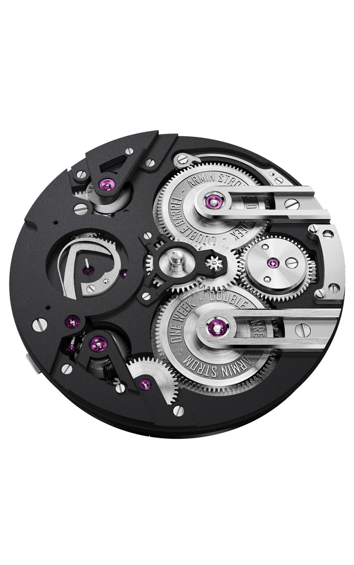 The new manual-winding ARM21 calibre features two mainspring barrels which work in series to provide consistent levels of energy to the gear train. Held by two finger-style bridges, the barrels are symmetrically arranged and take up the right portion of the completely open dial. The 7-days power reserve is indicated by a cone system, inspired by pocket watches.