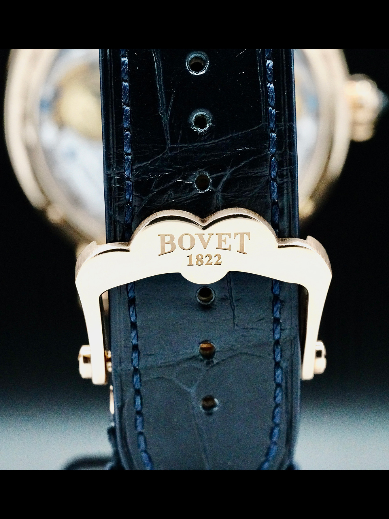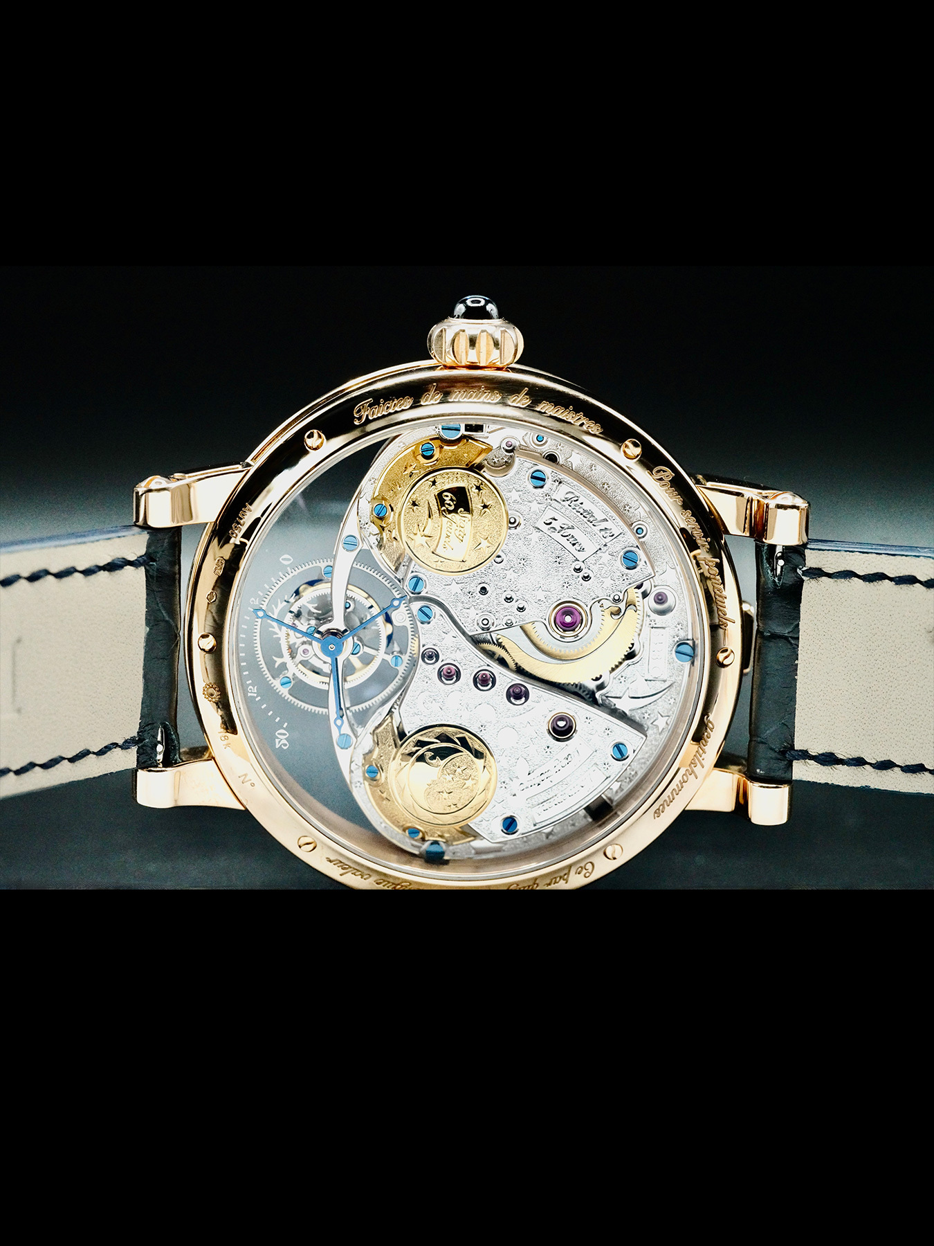 This Bovet Shooting Star Recital features a 46mm 18k red gold case with an exhibition case back on a black leather strap. This watch also sports a skeleton dial with blue hands covered by scratch resistant sapphire crystal.